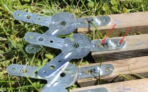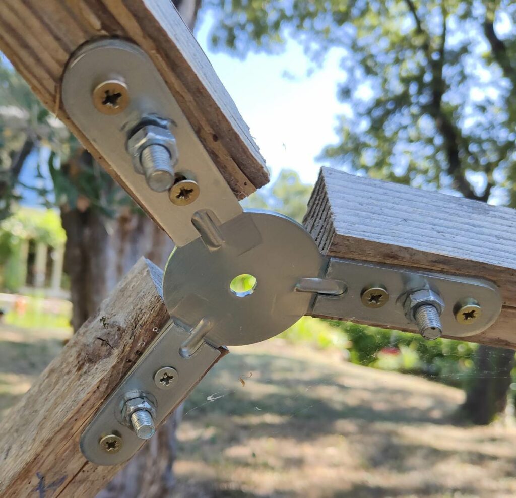 IMPORTANT: To maintain the shape of the structure as much as possible, it is essential to use 3 screws in each connector branch: the large central bolt and 2 wood screws on either side. If you do not use these 3 screws on each branch, the dome will flatten over time.