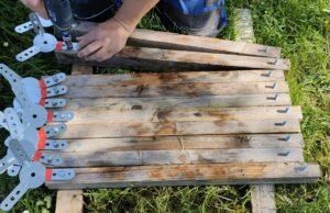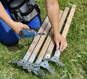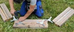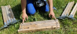 Take 5 new uprights. Place the 10 uprights above to the left and right of these 5 uprights and screw them in (don’t forget the wood screws):