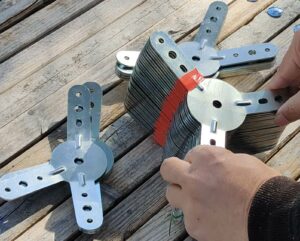 Lay these 5 uprights in a circle with the connectors screwed on top, inserting a large upright between each of them: